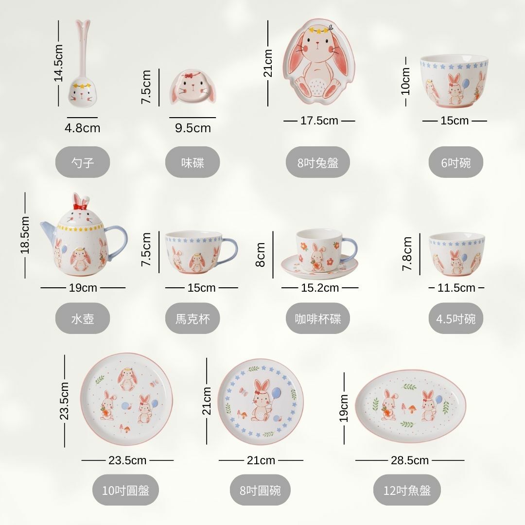 ‧樣式:4.5吋碗 / 6吋碗 / 馬克杯 / 咖啡杯碟 / 茶壺 / 8吋不規則盤 / 8吋圓碗 / 10吋圓盤 / 12吋魚盤 / 勺子 / 味碟