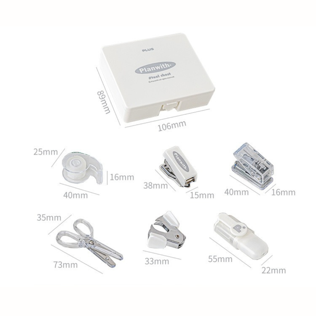 ‧尺寸: 膠帶台40mm x 25mm x 16mm、 釘書機38mm x 15mm、螢光筆55mm x 22mm、剪刀73mm x 35mm、取釘器33mm 、打孔器40mm x 16mm