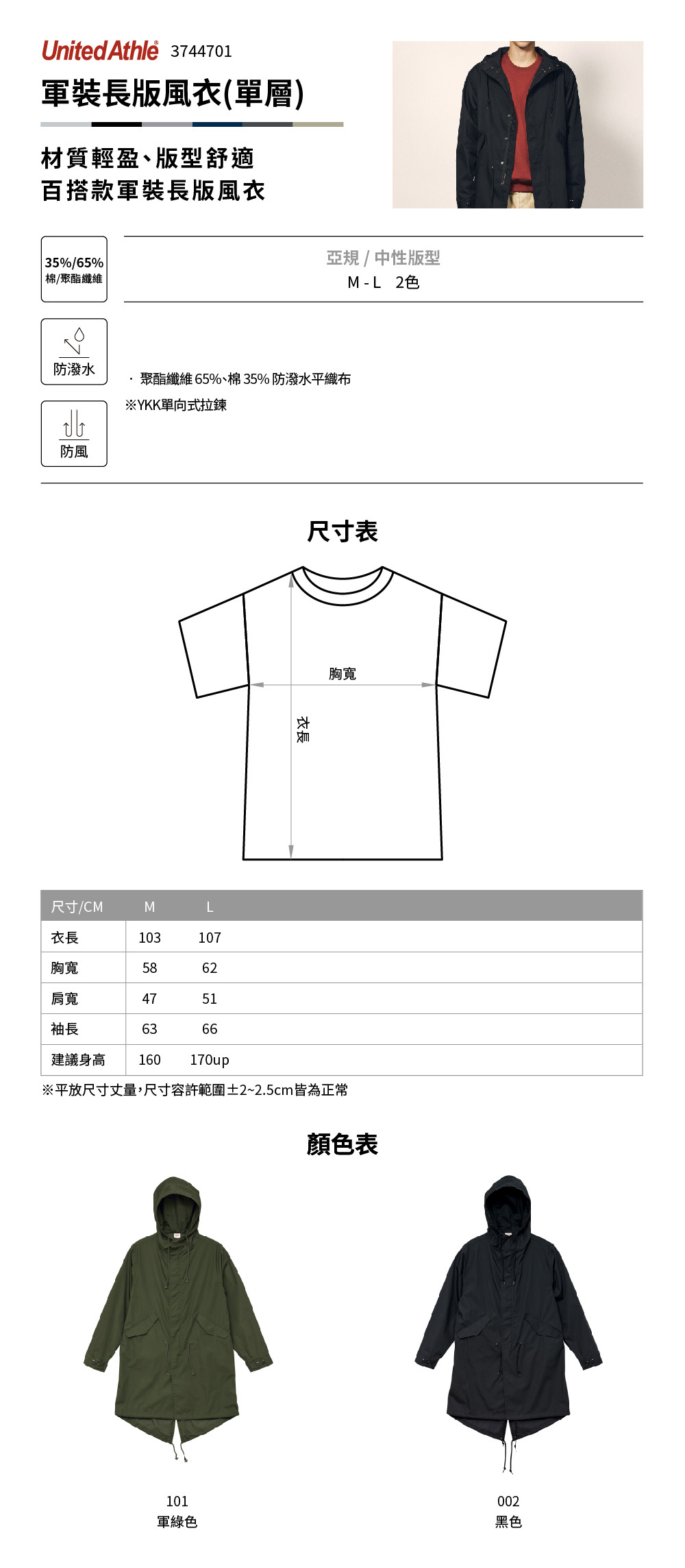 ● 聚酯纖維 65%、棉 35% 防潑水平織布