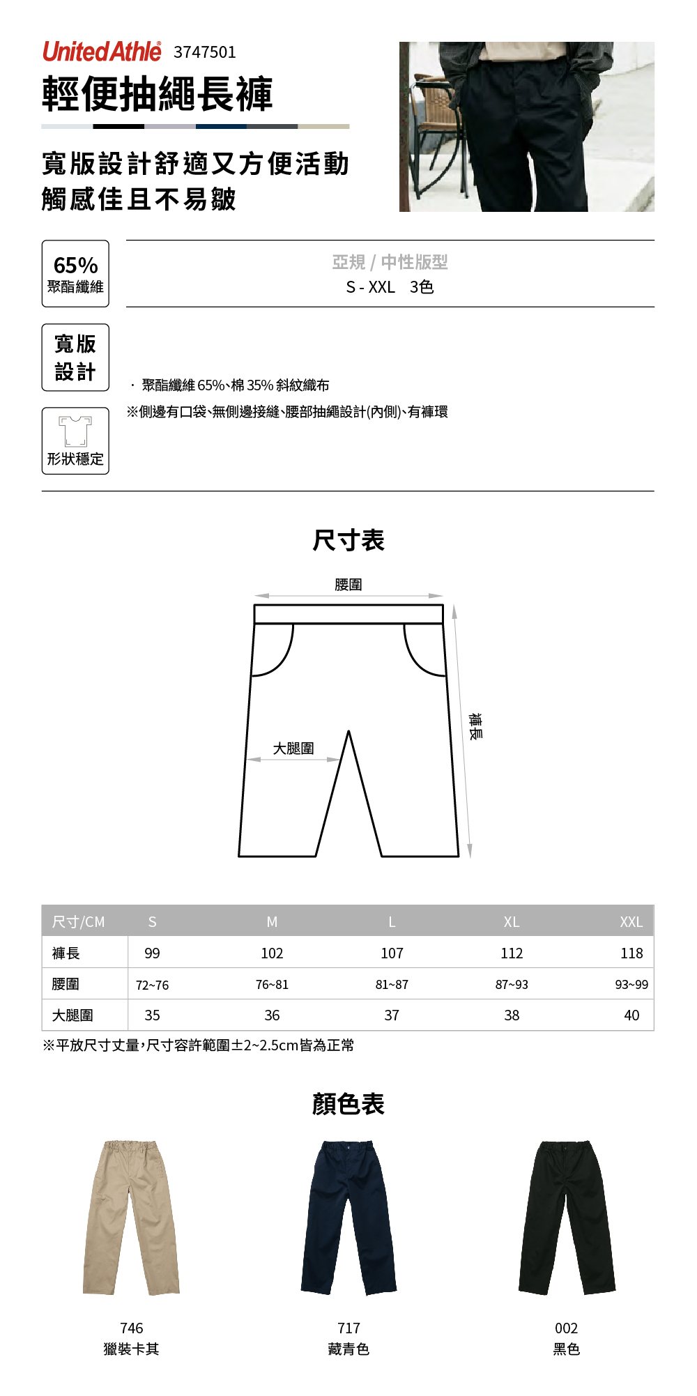 ※側邊有口袋、無側邊接縫、腰部抽繩設計(內側)、有褲環