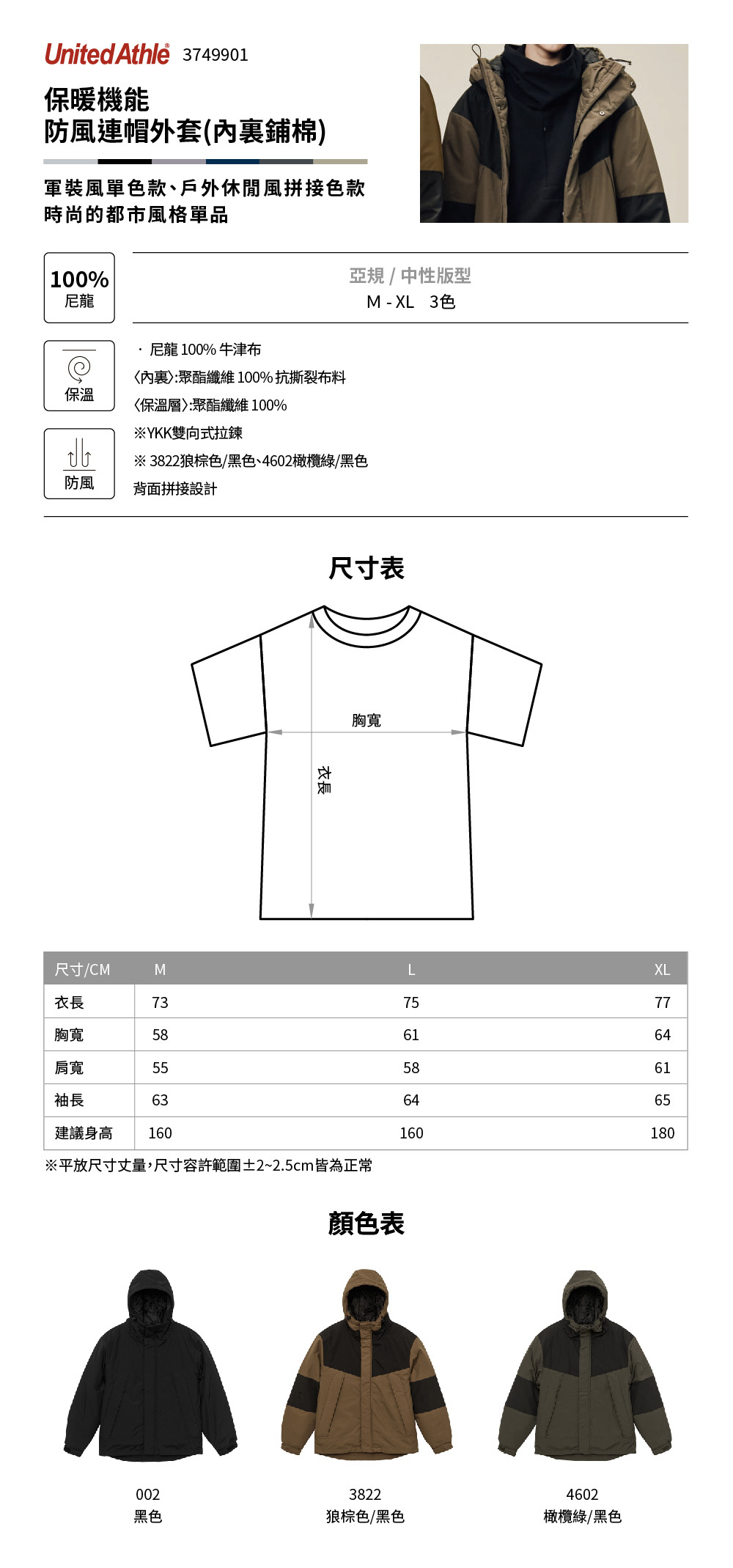 • 尼龍 100% 牛津布〈內裏〉:聚酯纖維 100% 抗撕裂布料〈保溫層〉:聚酯纖維 100%※YKK雙向式拉鍊※ 3822狼棕色/黑色、4602橄欖綠/黑色背面拼接設計